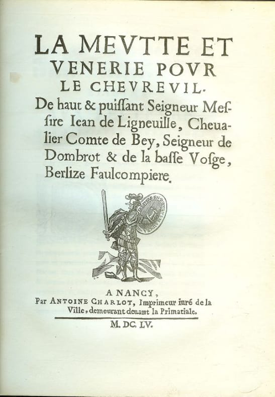 Le tire complet est “La meutte et venerie du haut et puissant seigneur Messire Jean de Ligniville Chevalier, comte de Bey, Seigneur de Dombrot et de la Basse Vosges, Berlize, Faulcompierre, etc., grand-veneur de Lorraine de 1602 à 1632”. Reproduction du titre et du texte de l’édition de 1655, exception faite des fautes d’impression et des régularisations d’orthographe afin de donner un sens à ce texte ancien tout en conservant l’esprit et le cachet de son auteur et de son temps. Cette réimpression de la rarissime édition originale a été faite par les soins du Baron Grandjean d’Alteville. Thiebaud col. 598/599.