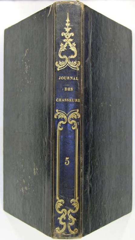 Journal des chasseurs, Paris, 1840-1841. In/8 reliure pleine percaline verte, dos lisse à décor et titres dorés, tranches marbrées, 13 gravures hors-texte en noir et bistre (dont 1 sur papier de chine), 440 pages..