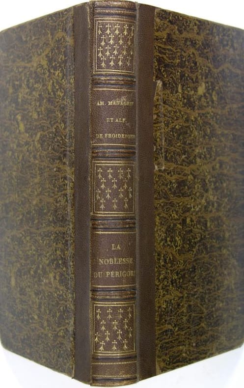 in/8 reliure demi-chagrin marron, dos à nerfs à caissons dorés, tranches rouges : Périgueux, 1857. 186 pages. suivi de : Armorial de la Noblesse du Périgord, Perigueux, Dupont, 1858, 16 pp, frontispice, 570 blasons, sans pagination.