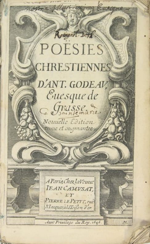 1660 Paris: Chez Pierre Le Petit, 1660. In-12: 8.5 x 15 cm, 51 pp. [titre, épître au cardinal de Richelieu, discours], 2 ff. n. chiff. [table, privilège], 508 pp. Édition collective des uvres chrétienne dAntoine Godeau, lun des premier membres de lacadémie française, membre de la Compagnie du Saint-Sacrement, nommé évêque de Grasse par Richelieu. Reliure en veau brun. Dos à cinq nerfs avec titre en capitales dorées et caissons aux petits fers. Plats frappés aux armes parlantes de Colbert. Ex-libris, apposé ultérieurement, aux armes de la famille de Dreux-Brézé. Gouttières fragilisées, coins renforcés. Papier propre. Curieux exemplaire.