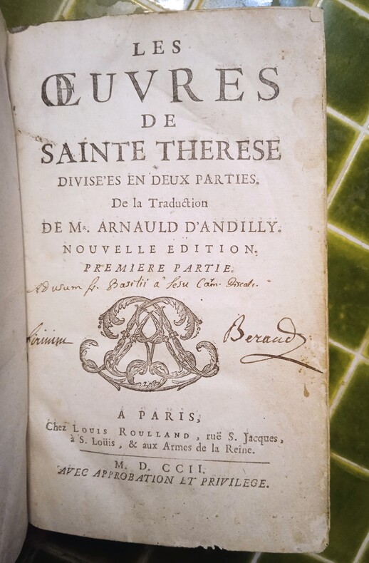 Paris, Chez Louis Roulland, 1702. Un fort volume in-8° (13 cm x 19,5 cm), reliure cuir de l’époque, quelques frottements et marques d’usage mais reliure solide, intérieur frais dans l’ensemble (quelques rares taches et 4 pages un peu froissés). [12] + 886 pages. Un beau portrait gravé de la sainte. Ex-libris « Firmin Beraud » et « Ad usum fr. Basilii à Jesu Carm. Discalc. ». Tome 1 (sur 2) seul.