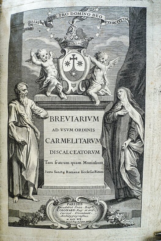 Ce bréviaire à l’usage des Carmes déchaussés (partie d’hiver) est un magnifique texte liturgique latin destiné à l’office quotidien des religieux et religieuses de l’Ordre. Il suit le rite romain tout en intégrant les fêtes propres à la famille carmélitaine, fortement marquée par la spiritualité de la Vierge du Carmel, de Thérèse d’Avila et de Jean de la Croix. Le volume, typique de l’imprimerie religieuse du début du 18e siècle, présente un texte en deux colonnes avec rubriques, grandes lettrines et signes liturgiques très lisibles, ainsi que de belles illustrations. Peu courant.