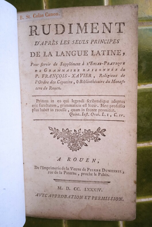 Édition originale peu courante de cet ouvrage didactique sur les rudiments de la langue latine, par un religieux de l’Ordre des Capucins et bibliothécaire du Monastère de Rouen.