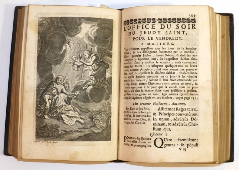 Lyon, Pierre Valfray, 1718. 1 volume in-8° (13 x 20 cm), maroquin noir, dos à nerfs orné d’encadrements de pointillés dorés, même encadrement sur les plats, coupes guillochées, tranches dorées, quelques légères usures aux plats et galeries de vers sans gravité (reliure de l’époque). Titre-frontispice hors-texte par Ogier et 5 figures à pleine page de Mathieu Ogier, graveur à Lyon de 1676 à 1709. (7) ff. + 752 pp. Quelques rares rousseurs. Bon exemplaire.