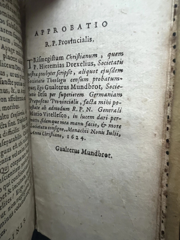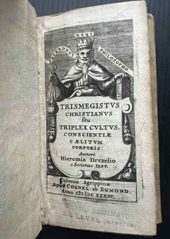 Prédicateur de l’électeur de Bavière, Jérémie Drexel fut un écrivain jésuite influent de la Contre-Réforme, connu pour ses traités de morale chrétienne. Le Trismegistus Christianus développe la notion du « triple culte » : de la conscience, des saints et du corps, dans une perspective allégorique et spirituelle, inspirée à la fois de la mystique chrétienne et du symbolisme hermétique. La présence des gravures et de la reliure en vélin d’époque fait de cette édition latine un exemplaire de grand intérêt bibliophilique. Caillet, 3248 ; de Backer, Bibliothèque des Écrivains de la Compagnie de Jésus, I, pp. 269-272.