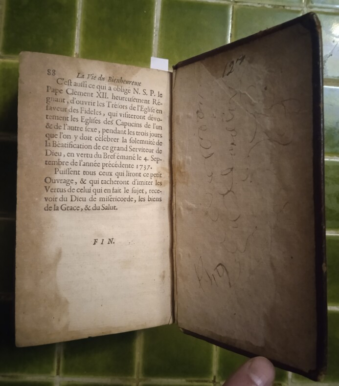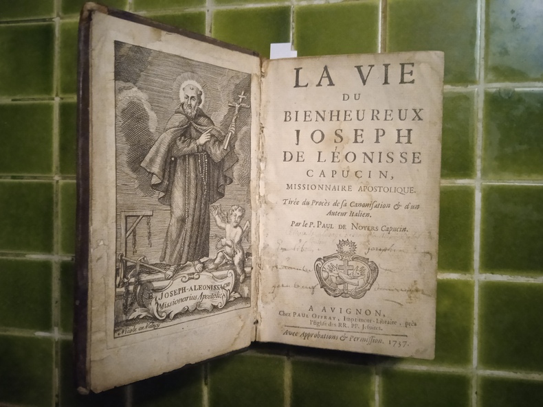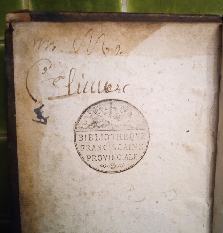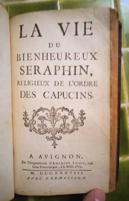 Avignon, Paul Offray, 1737 et Avignon, Antoine Louis, 1738. 1 volume in-12 (9,5 cm x 15,5 cm), basane brune (reliure de l’époque usagée), dos à nerfs, tranches rouges, étiquette de la bibliothèque franciscaine provinciale contrecollée sur le contreplat, ex-libris manuscrit sur la page de titre de François Alexis Delot de Roussay daté de 1823, 282 + 88 pages (complet). Frottements à la reliure, coiffe de pied découverte avec galeries, 1 mors fendu, mouillure sur le plat supérieur, quelques rares mouillures, feuillet de frontispice restauré en début d’ouvrage, première page de titre détachée.