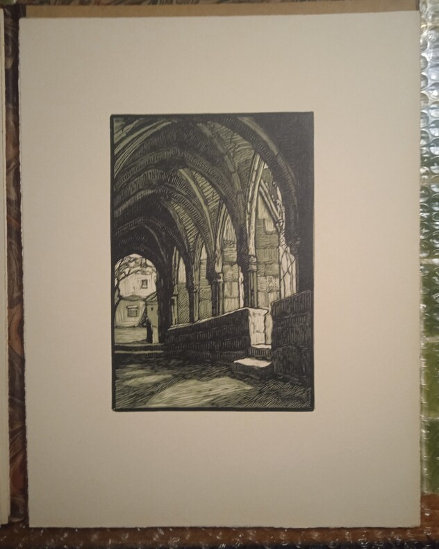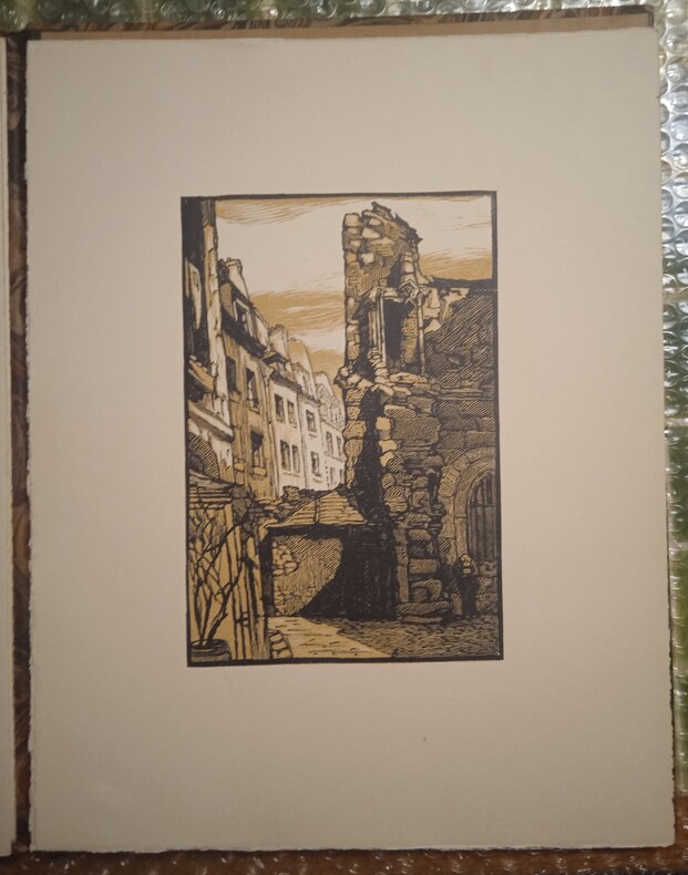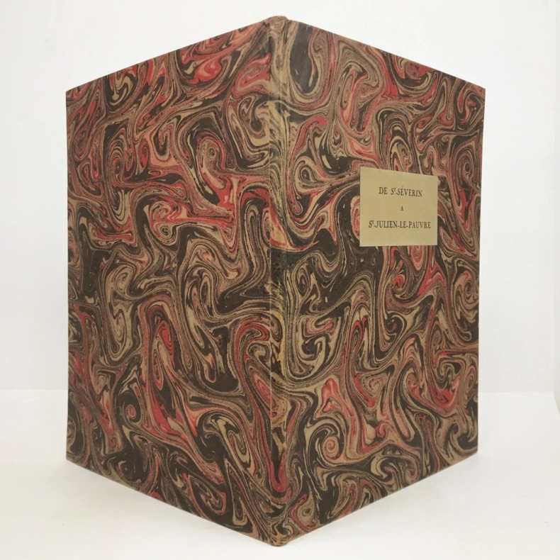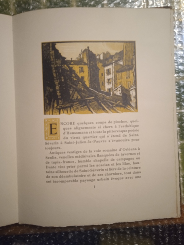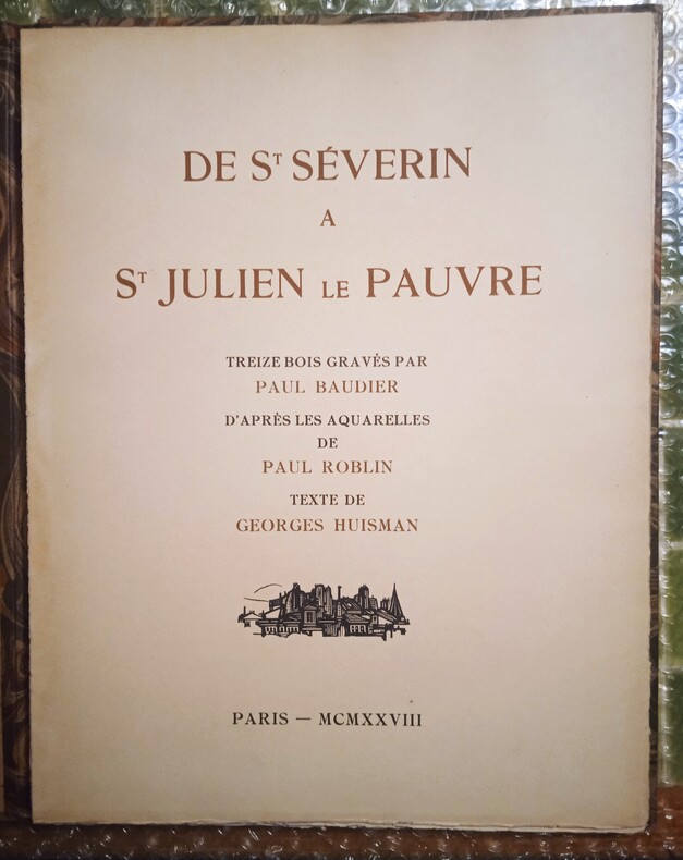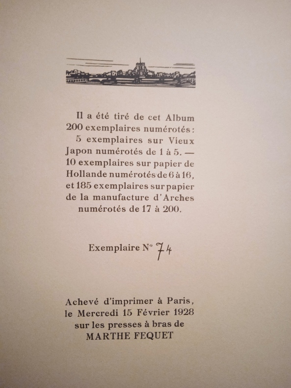 Paris, s. n., 1928. 1 volume in-folio (26,5 x 34 cm), en feuilles, chemise de l’éditeur avec étiquette collée sur le premier plat avec le titre imprimé en noir, ex-libris de Serge Barrier sur le contreplat de la chemise. 8 pages de texte et 9 planches (parait complet). Sommaire des gravures et feuillet de justification insolés. Bon état général. Édition illustrée de 13 bois gravés en un, deux ou trois tons par Paul Baudier, d’après les aquarelles de Paul Roblin, dont 9 hors-texte et 4 in-texte. Imprimé sur les presses à bras de Marthe Fequet. Tirage à 200 exemplaires, celui-ci 1/185 sur papier de la manufacture d’Arches, (n° 74).