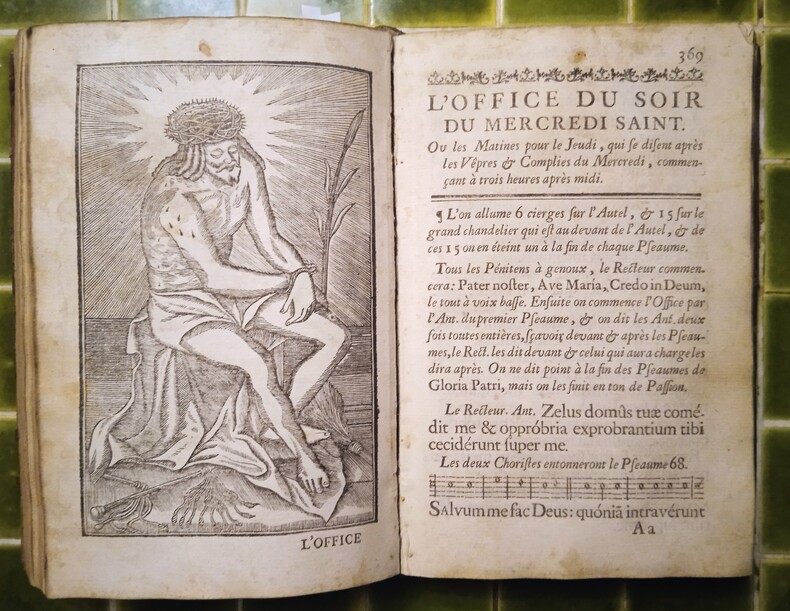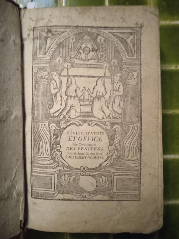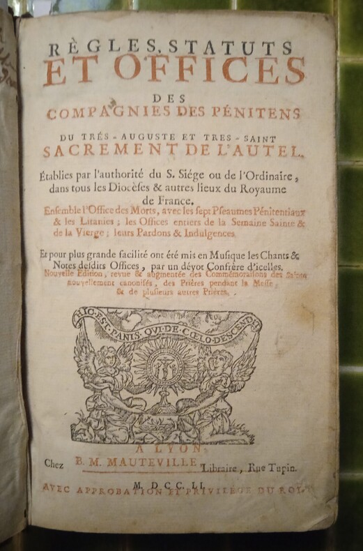 Édition illustrée d’un titre-frontispice, d’une jolie marque de l’imprimeur au titre et de 2 gravures, dont une passion. Nouvelle édition de ce véritable manuel des pénitents, compilant les textes officiels et les rites particuliers. L’édition contient la bulle de Paul V instituant les indulgences pour l’Archiconfrérie du très-saint Sacrement de l’Autel, l’avertissement de l’évêque de Lyon, de nombreuses prières, ou encore la cérémonie d’entrée d’un novice.
