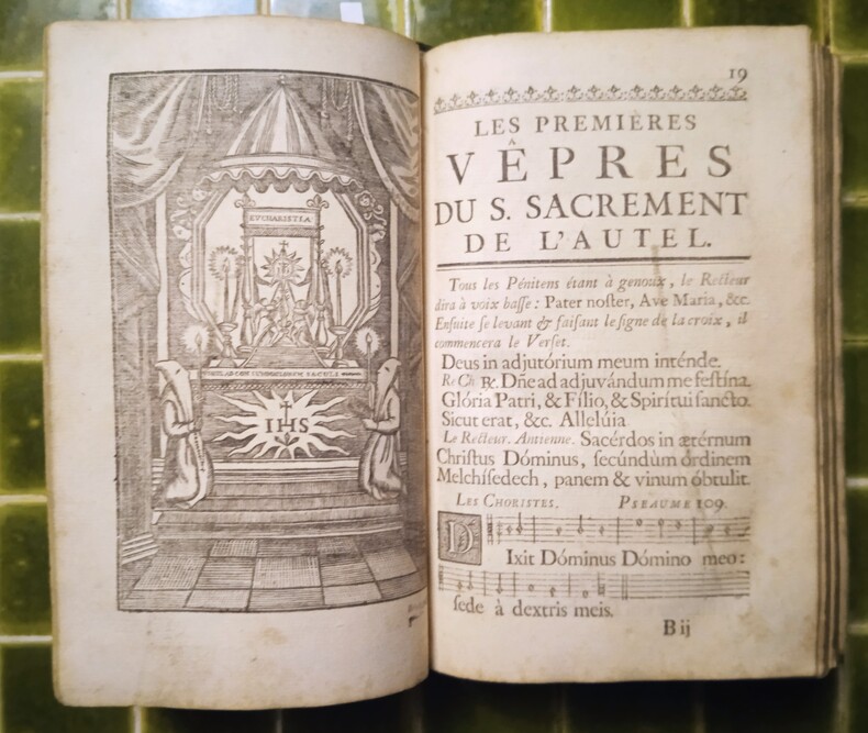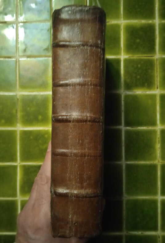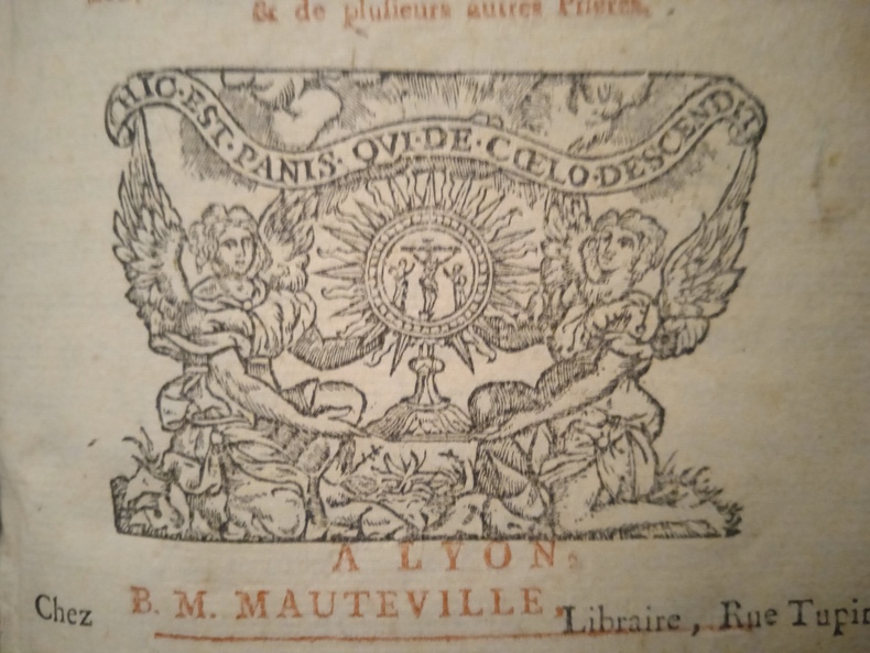 Lyon, B. M. Mauteville, 1751. 1 volume in-8° (13 x 20,5 cm), basane brune (reliure de l’époque), dos à nerfs muet, discrète marque à froid de la Société du Saint Sacrement sur les plats (taches sur les plats supérieur, 3 coins émoussés, un cahier un peu lâche, usure mais ensemble correct quand-même). Page de titre en rouge et noir, CXII + 668 + [20] pages (complet). De rares taches ou rousseurs, petites galeries de vers en haut de quelques pages en fin d’ouvrage. Mentions manuscrites de propriétaires (Joseph Tournon à Grenoble, André Vallantin…).
