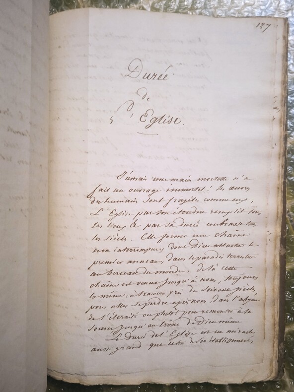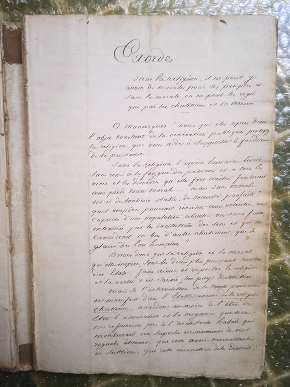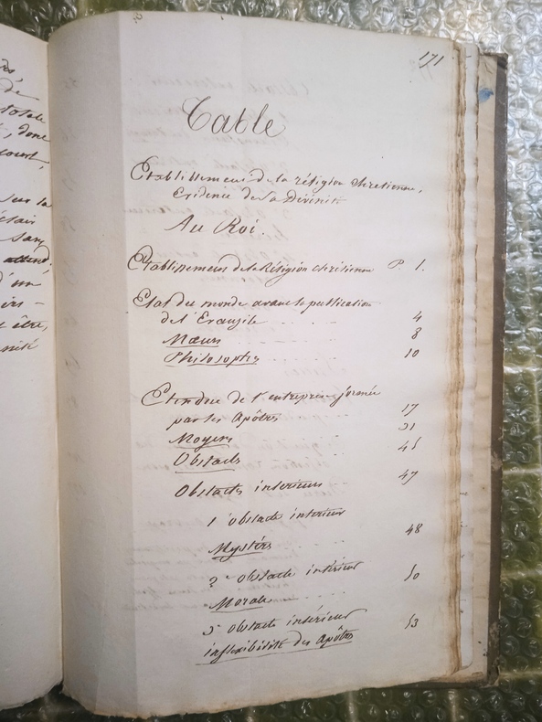 L’auteur, un certain Bouisson, était chevalier de l’Ordre Royal de Saint Hubert de Lorraine. Lire de Patrick de Villepin, L’ordre de Saint-Hubert de Lorraine et du Barrois : 1416-1852, entre chevalerie et vénerie (Éditions Guénégaud, 1999). Ouvrage apologétique, précédé d’une dédicace au roi Charles X, datée de septembre 1824. Le nom du destinataire semble avoir été changé (Charles X devient roi en septembre 1824). Notons encore que l’ordre de Saint-Hubert du duché de Bar, un ordre de chevalerie créé en 1422, fut définitivement supprimé en France en 1824. Il y est question des mœurs et des hérésies. A la page 177, notre auteur a reproduit la croix de Raban Maur, poème figuré dont la forme du texte représente une croix. « Le plus grand spectacle qui ait jamais été donné à l’univers, c’est l’établissement de la religion chrétienne. » ; « Sans la religion, il ne peut y avoir de morale et sans la morale, on ne peut les régir que par les châtimens et la terreur. » ; « La décadence des peuples commence où finit l’empire de la religion. »