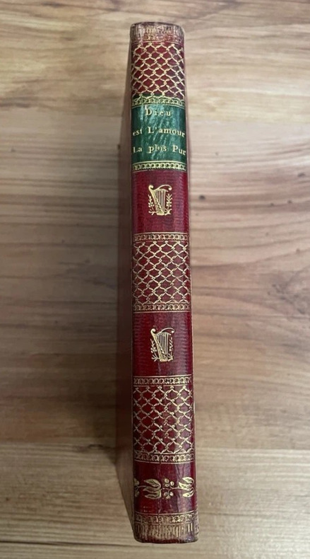Chez Collignon, Imrimeur-Libraire Metz 1805 In-16 ( 140 X 85 mm ) de 305 pages, plein cuir-de-Russie vert, dos lisse et plats ornés de roulettes dorées ( Reliure de l'époque ). Rare édition d'une traduction française de "Gott ist die Reinste Liebe" du mystique catholique allemand Karl Von ECKARTSHAUSEN ( 1752-1803 ). En plus d'aborder des thèmes tels que le destin, l'adversité, le devoir, la conscience et la méditation, l'uvre d'ECKARTSHAUSEN comprend des prières pour les ennemis, les parents, le conjoint et les enfants, ainsi que pour les temps de guerre et de tempête, et se termine par une prière attribuée à l'écrivaine anglaise Elizabeth SINGER ROWE ( 1674-1737 ). Coins émoussés, bel exemplaire.Caillet N° 3506 "un des plus célèbres écrivains mystiques de l'Allemagne. ce livre écrit sous une forme chrétienne cache le plus pur déisme" - Dorbon N° 5652.