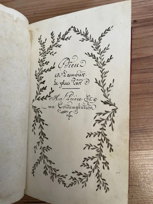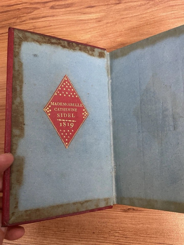 Livre de prières (et d’union conjugale) entièrement manuscrit d’Alexis Laurent Kien, dédié à Catherine Sidel (avec leurs deux ex-libris respectifs). Notons que l’on trouve un Alexis Laurent Kien notaire à Saverne (dans le 67, Bas-Rhin). Superbe et émouvant livre objet en très bel état.
