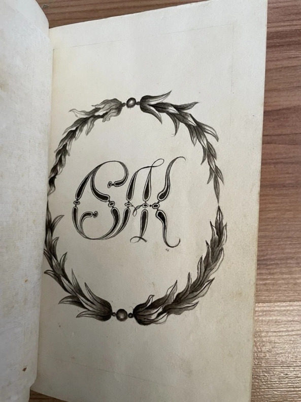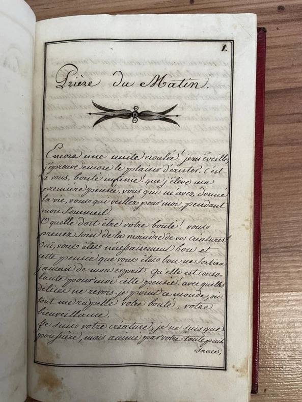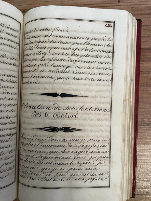 25 décembre 1819. In-12 (11 x 18,5 cm), reliure maroquinée rouge de l’époque, beau dos lisse orné, encadrement sur les plats, « Souvenir » sur le premier plat, roulette sur les coupes, toutes tranches dorées, conservée dans son étui d'origine. Belle écriture soignée, texte encadré et calligraphies, rares pages laissées blanches, de 296 + (4) pages. Majoritairement en français, avec quelques pages en allemand dans une seconde partie.