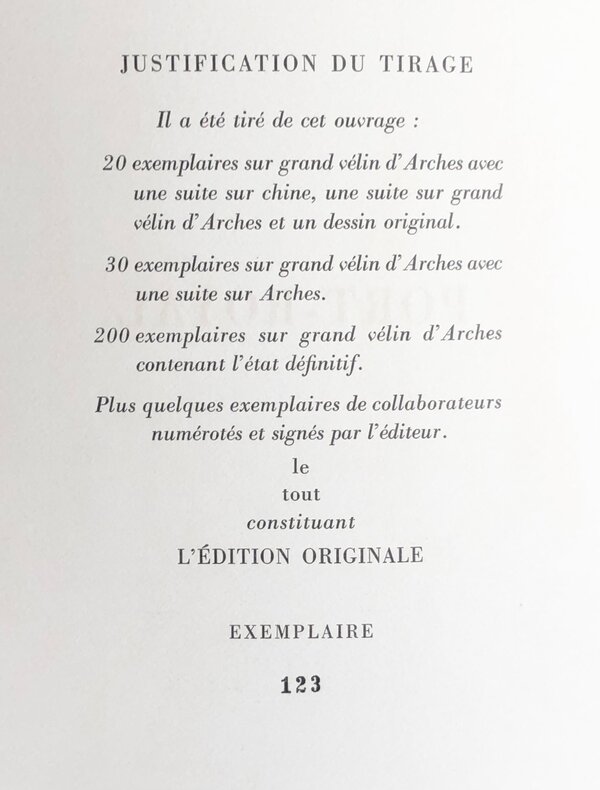 Paris, Henri Lefebvre, 1954. Un volume in-4° (26 x 33 cm), en feuilles, sous couverture rempliée, chemise cartonnée et étui. Légères usures sur l’étui. Intérieur très frais, sans rousseurs. 154 pages. Un des 200 exemplaires numérotés sur grand vélin d’Arches contenant l’état définitif (sur 250 exemplaires numérotés en tout).