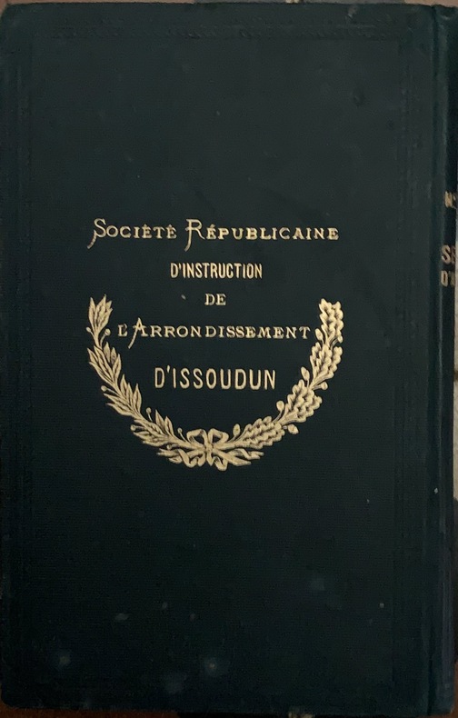 1879 Paris, Hachette, 1879; in-12 de (4), 209pp.; pleine percaline verte de l' éditeur, titre et décor dorés au 1er plat, fer doré de la Société Républicaine d'Instruction de l'Arrondissement d'Issoudun poussé au 2e plat, titre doré au dos; Petites traces d'étiquette de prix enlevée à l'intérieur du 1er plat, très petites décolorations au 2e plat. Bel exemplaire.