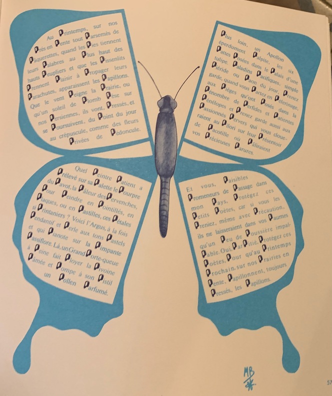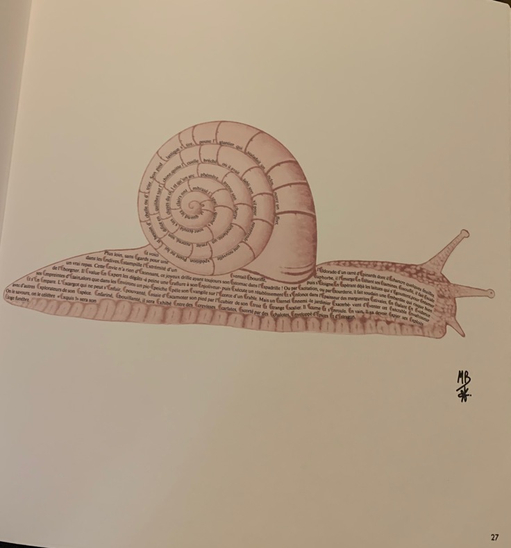 Ensemble de textes poétiques - calligrammes empruntant des formes animales ou autres: araignée, blason, coquillage, escargot , usine, fleur… et un paon pour la couverture. (GrMD)