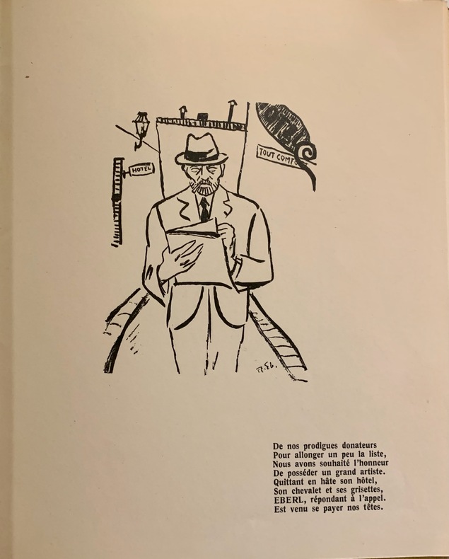 Artiste de l'Ecole de Paris, Eberl, peintre, dessinateur et illustrateur était spécialisé dans les portraits et les nus. La présente plaquette est une commande de l'association amicale des personnels des Établissements Lambiotte Frères, des Produits Lambiotte et du Comptoir français du charbon de bois épuré, les membres de l'association (23), mais également l'éditeur et le peintre, en autoportrait, sont ici croqués par Eberl. Préface signée J. V. ( Joseph Vanadruel, secrétaire de l'Association). Les frères Lambiotte originaires des Ardennes s'installèrent dans le Morvan pour la fabrication du charbon de bois. (S2°