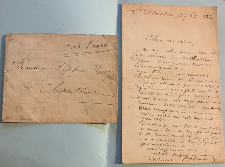 Lettre autographe signée, de St Sébastien, 11 - 7bre 1883 à " Cher Monsieur". Rollinat remercie Ponroy pour des renseignements qu'il lui a procurés, puis poursuit " Depuis ce matin , nous sommes à l' Hôtel du Lion d'or où nous restons en attendant que nous soyons définitivement casé, faites nous donc l'amitié de venir déjeuner demain…". Il projette de les emmener visiter trois logements et termine " l'induction que vous tirez de mon écriture est presque bonne en tous points; quant à votre rondel sur le Bain, je l'ai trouvé très alerte et d'un piquant très artistique…". 1 page in-8°, enveloppe jointe ( poussiéreuse et ayant servi à prendre des notes au crayon de papier). Plusieurs ratures.