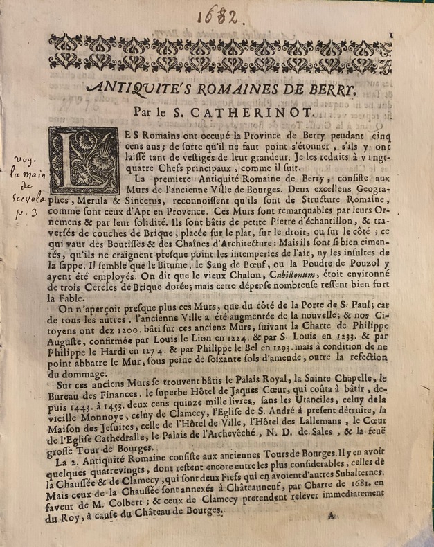 1682 Bourges, 1682; pièce in-4 de 8pp.; lettre ornée. Plusieurs annotations manuscrites en marge. Pièce vraisemblablement sortie d'une reliure, avec traces de couture. Edition originale.