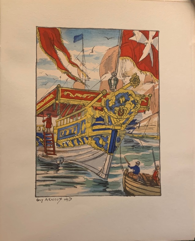 1945 Paris, Les Editions de Paris, 1945; petit in 4 broché de (2) ff. - 257pp.- (2)ff. Illustré dans le texte de culs-de-lampe et vignettes en deux tons (noir et bleu) et hors texte d'aquarelles de Guy Arnoux reproduites en couleurs par la société "Le Coloris". Couverture crème imprimée en bleu, chemise et étui cartonnés bleu, dos muet. Ex-libris étiquette orné au 1er feuillet blanc. Edition tirée au total à 900 exemplaires , 50 sur BFK de Rives et 850 sur vélin supérieur. Ici exemplaire hors commerce, marqué "H.C", sur BFK dev Rives