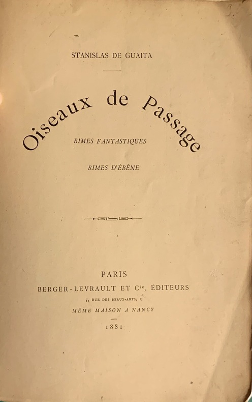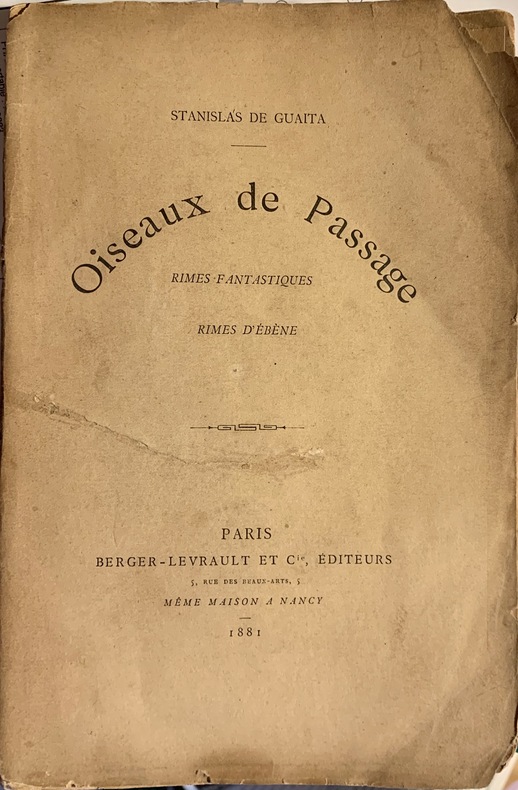 Stanislas de Guaita ( Tarquimpol, Moselle, 1861-1897), poète, théoricien, historien de l'ésotérisme, auteur de bibliographie est le co-fondateur de l'Ordre kabbalistique de la Rose-Croix.Couverture passée avec petits manques angulaires sur les plats, déchirure sans manque au 1er plat, manque de papier au dos. Exemplaire en bon état intérieur, méritant une reliure. ( Reu-Bur)