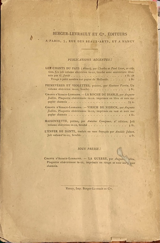 Paris, Berger-Levrault et C!e, éditeurs, 1881. E.O. In-12°, 151 pp., intérieur frais. Br., couv. sous rhodoïd (couv. lég. salie, dos fragile, petites manques en milieu, tête et queue de dos). Bel exemplaire sinon.