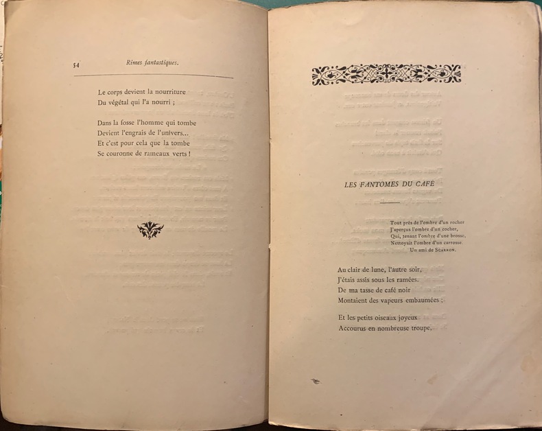 1881 Paris, Berger-Levrault, 1881; in-16 de (6) - 151pp.- (1) f. blanc.; couverture crème imprimée en noir au dos et 1er plat. Ex-libris étiquette orné sur le 1er feuillet blanc. Edition originale, de ce rare et premier recueil de poèmes du spécialiste de l'ésorisme.