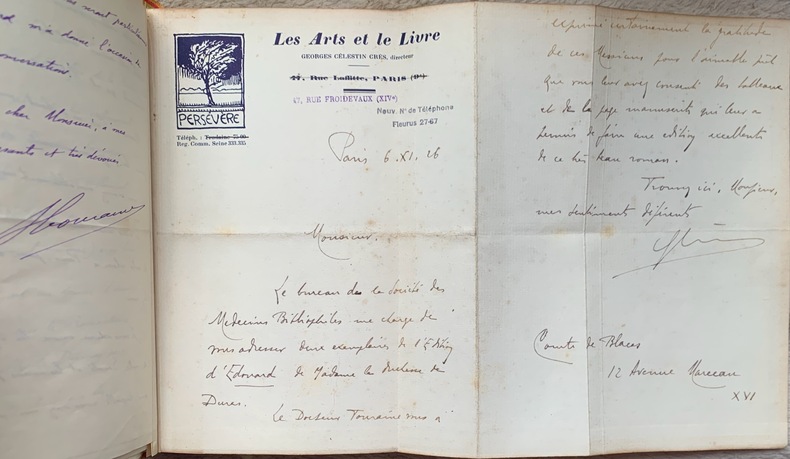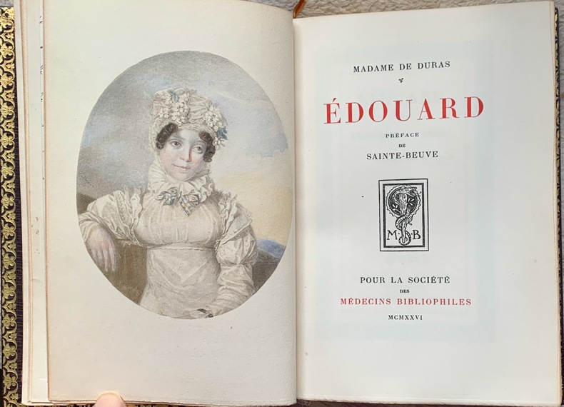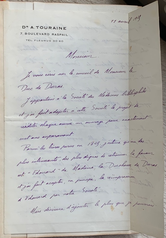 Ouvrage enrichi de 4 lettres autographes signée, reliées en début d'ouvrage dont 3 du Dr Touraine, de la Société des Médecins Bibliophiles, au Comte de Blacas, qu’il a contacté sur les conseils du Duc de Duras. Il interroge son correspondant sur un éventuel tableau de Mme de Duras et des correspondances qui seraient dans sa famille. Il précise que la Société des Médecins bibliophiles s’attache à publier chaque année la réédition d’un ouvrage paru 100 ans auparavant. 6 pages in-8 et in-4, des 11 avril 1925, 15 mai 1925 et Novembre 1926, après la publication du livre. Et une lettre autographe signée à l’entête de “Les Arts et le Livre George Célestin Crès directeur” , lettre d’envoi de 2 exemplaires du livre à Monsieur le Comte de Blacas, qui a bien voulu prêter le tableau reproduit en frontispice et une lettre, dont le fac-similé se trouve dans cette nouvelle édition ( pp. 178-179). Dos légèrement bruni uniformément, mais bel exemplaire enrichi, dans une reliure de Yseux ( Reu-CH1)