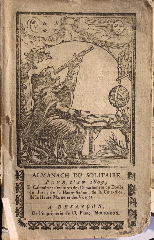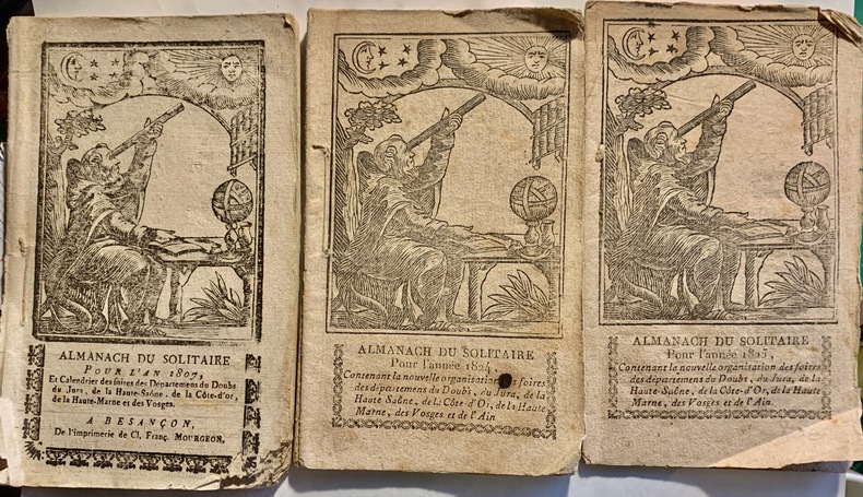 On joint : - l'Amanach du Solitaire pour 1824, contenant la Nouvelle organisation des foires des départemens du Doubs, du Jura, de la Haute Saône, de la Côte d'Or, de la Haute Marne, des Vosges et de l'Ain. Besançon, chez de St. Agathe; 36pp; Illustré à la première page mais pas à la dernière contrairement à celui de 1807 ( tache rousse à la 1er page). - l'Amanach du Solitaire pour 1825… Sans lieu, ni nom, ( Besançon); 36pp.; illustré à la première et dernière pages ( coins écornés). Ensemble de 3 Almanachs. ( GrFC)