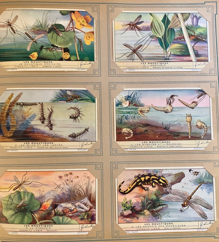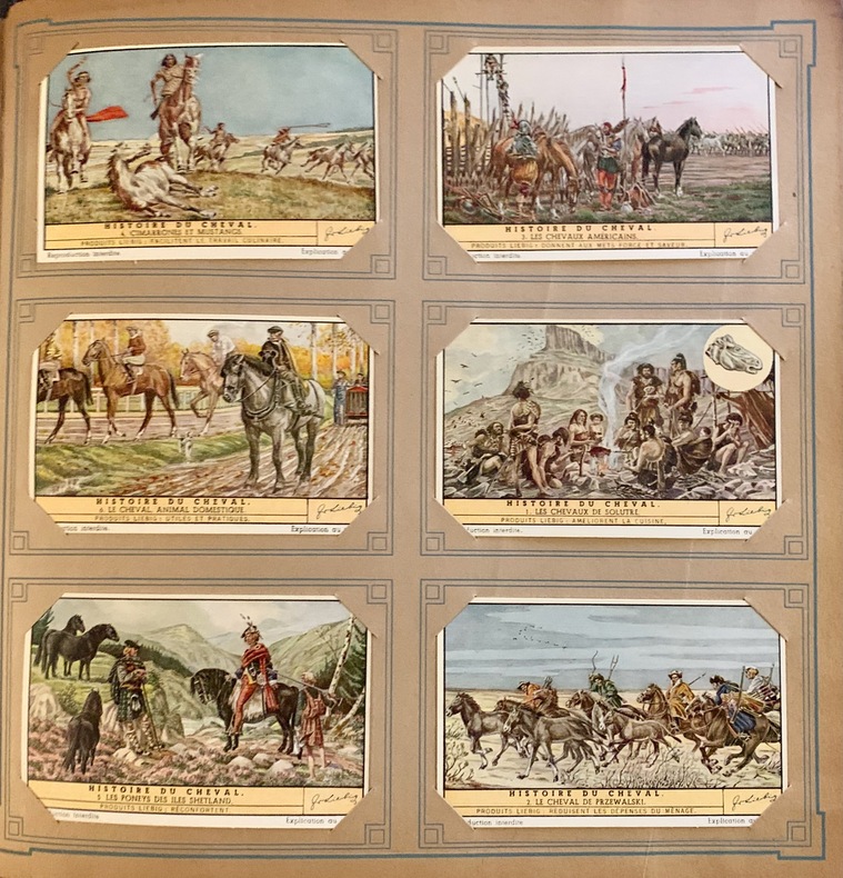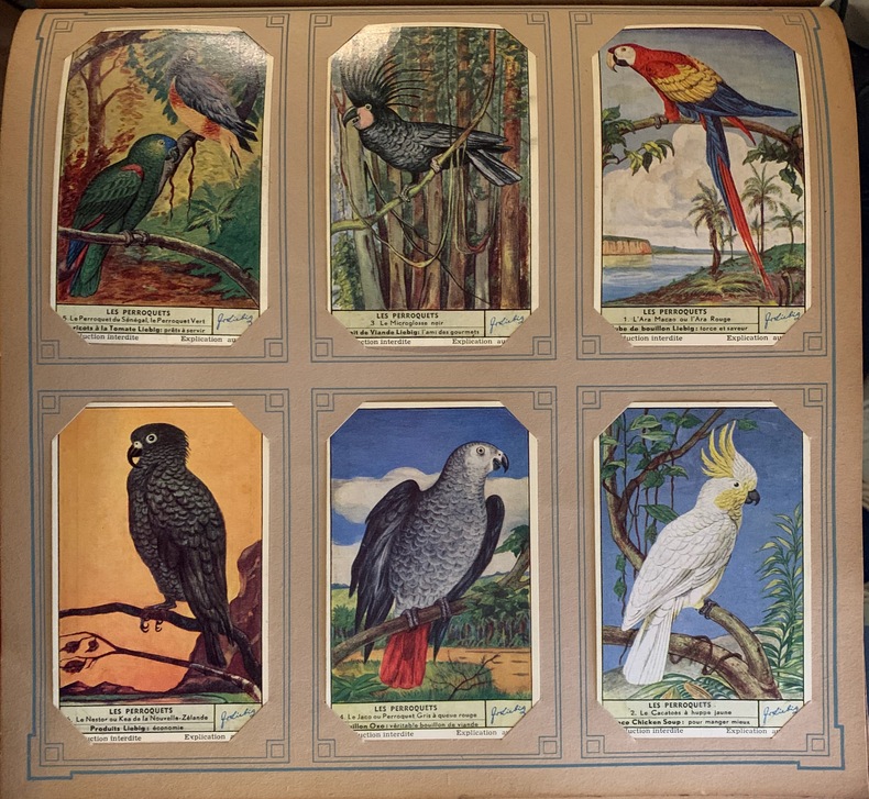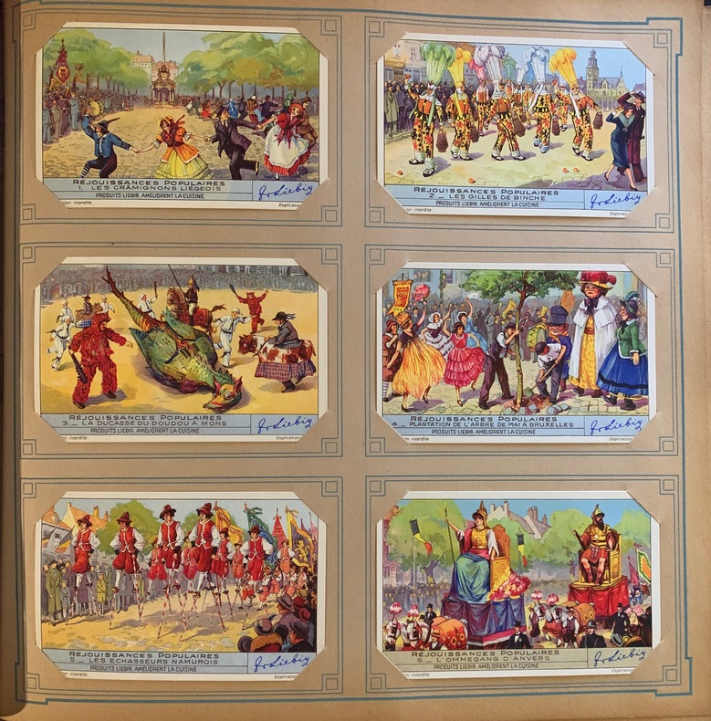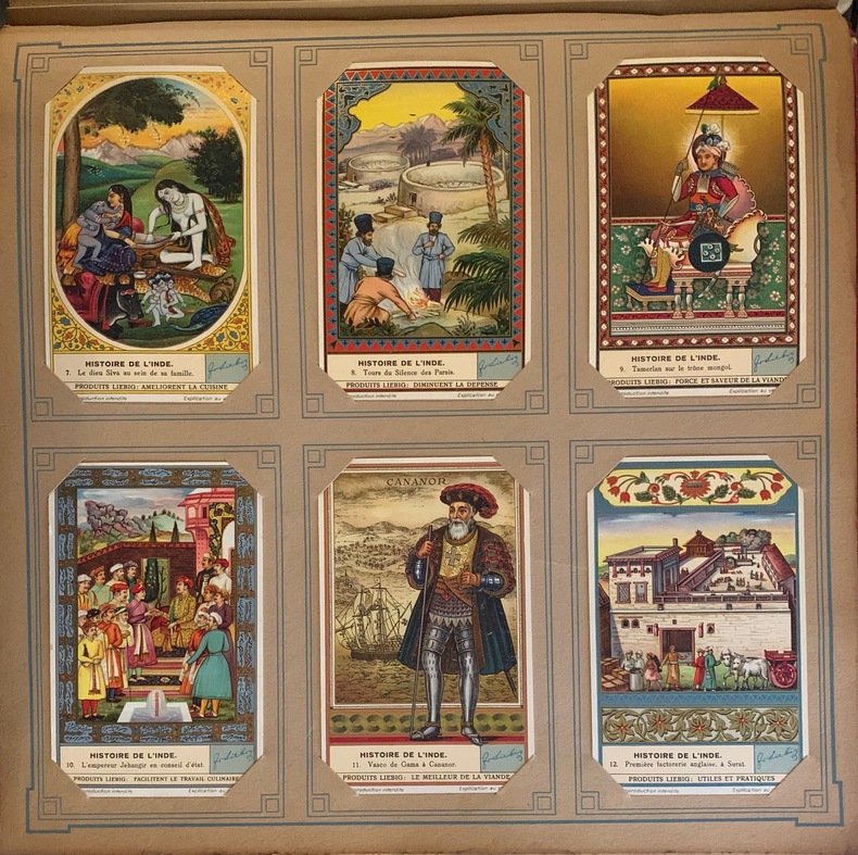 Album in-4 carré, plein cartonnage éditeur, titre en blanc au 1er plat, dos muet de toile rouge. 50 feuillets de 6 images chacun, soit au total 300 chromos Liebig en bon état.