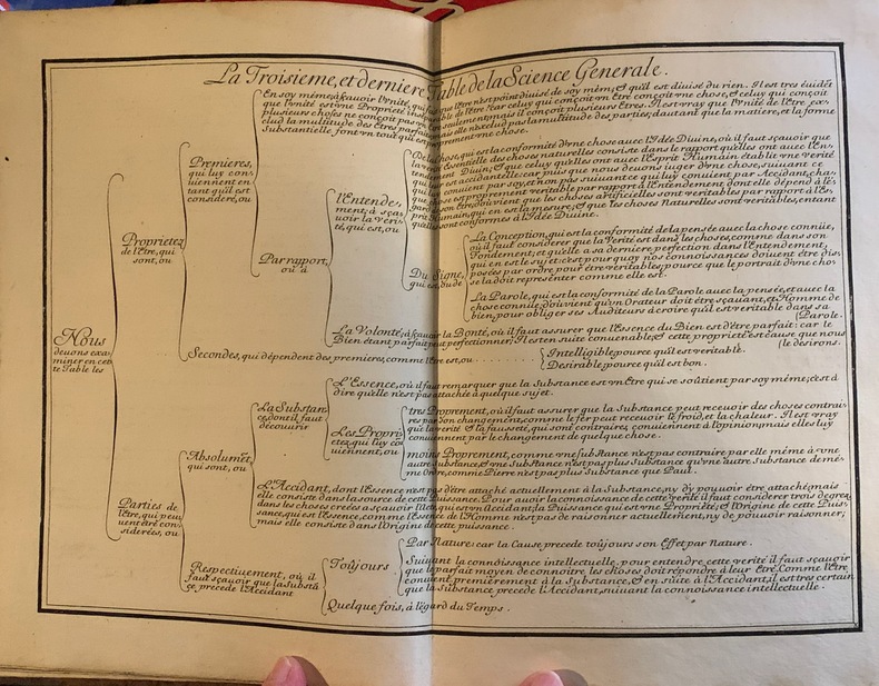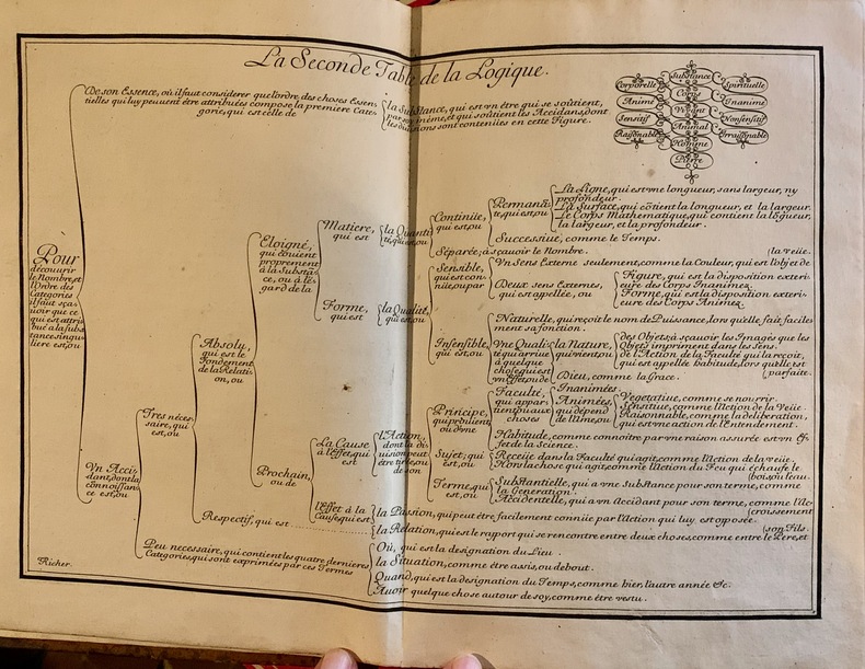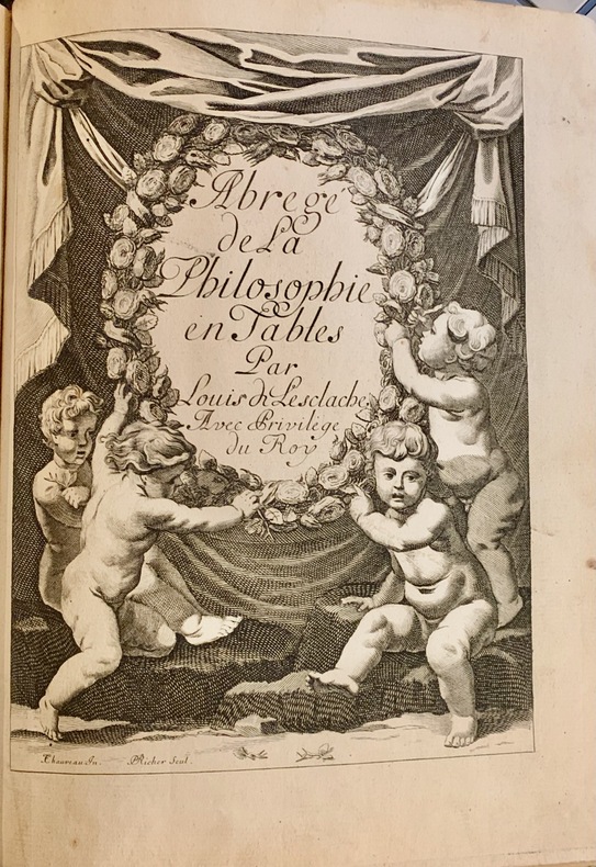 1650 Sans lieu, ni nom, ni date ( vers 1650); in-4 de 1 titre orné gravé par Richer d'après Chauveau et 36 tableaux gravés à double page, avec encadrement d'un double filet noir à chaque feuillet. Plein veau brun de l'époque, double filet doré encadrant les plats, dos à nerfs orné de fleurons dorés dans des compartiments de double filet doré, nom doré, tranches jaspées de bleu.Volume composé comme suit : Titre gravé, De l'utilité des Tables, De la Philosophie en générale, Ordre des Tables de la Philosophie, La Logique ( 6 tables chiffrées de 1 à 6 et dern.), Science générale ( 3 Tables de 1 à 3 et dern. ), La Physique ( 6 tables de 1 à 6 et dern.), Ordre des Tables de la Philosophie Morale, La Philosophie morale (14 tables de 1 à 14 et dern.), Théologie Naturelle ( 3 tables de 1 à 3 et dern.).