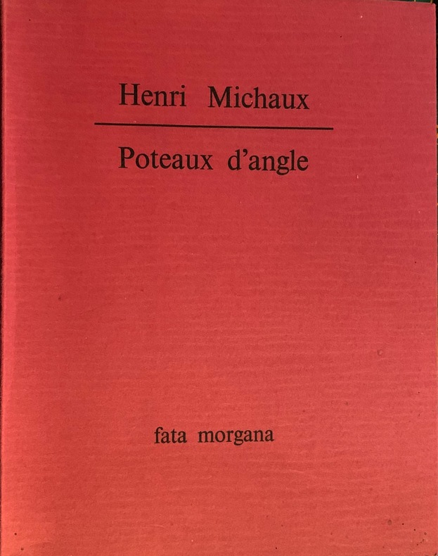 Montpellier L'Herne 1971 35 pp In-16 Broché Bel exemplaire 1 volume ÉDITION ORIGINALE rare. Un des 25 exemplaires numérotés de tête sur papier de Hollande.Des poteaux d'angle, autant des conseils du sage Michaux. Un texte qu'il voulait sec comme un coup de fouet, sous une couverture écarlate."Garde ce qu'il faut d'ectoplasme pour paraître "leur" contemporain"