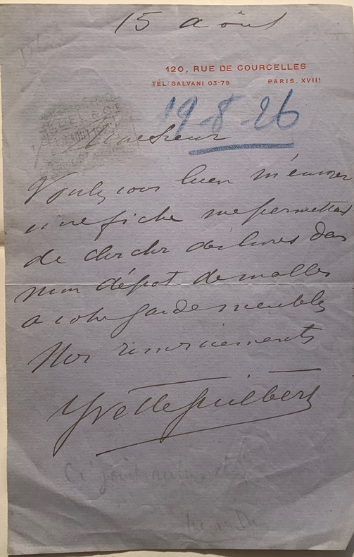 Lettre à entête datée de Paris XVIIe , 120 rue de Courcelles, du 15 août ( 1926); in-8 d'1 page sur papier bleuté. La chanteuse demande qu'on lui envoie une fiche pour chercher des livres " dans mon dépôt de malles à votre garde meubles…". Une main anonyme à indiquer la date de réception de la lettre au crayon bleu "19-8-26".