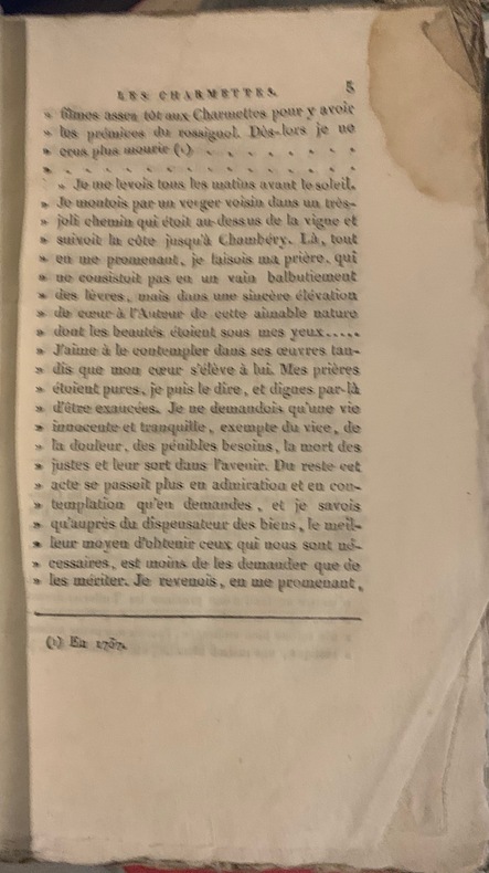 A Chambéry, R.R. Plattet, 1824. 22 x 13 cm, viij-79-[3] pages. Relié demi veau glacé ocre à petits coins, dos à nerfs orné, pièce de titre noire. Quelques traces d'usures, frottements et épidermures sans gravités. Sur la page de titre tampon de la "Bibliothèque de la Reine. Palais Royal."Troisième édtion de cette publication rédigée par G.- M. Raymond, propriétaire des Charmettes; c'est le 16 novembre 1810 qu'il acquiert la demeure de Mme de Warens, et entreprend de la restaurer. Barbier, III, 476b.Cest aux Charmettes, au cur de la campagne, sur les hauteurs de Chambéry, que le jeune Jean-Jacques Rousseau vit auprès de Madame de Warens, entre 1736 et 1742. Pendant cette période, la beauté du lieu, la compagnie dune femme aimante et des plaisirs simples tels que les promenades, la lecture ou la musique, suffisent à son bonheur. Cest la douceur de cette vie que Rousseau décrit dans les livres V et VI des Confessions et dans les dernières lignes des Rêveries du promeneur solitaire.Dans cet « asile un peu sauvage et retiré », Jean-Jacques Rousseau découvre lamour auprès de celle quil appelle « maman » et devient lhomme sensible quont admiré les romantiques. Autodidacte, cest aux Charmettes quil se crée un « magasin didées » qui sera le socle de sa pensée décrivain et de philosophe.