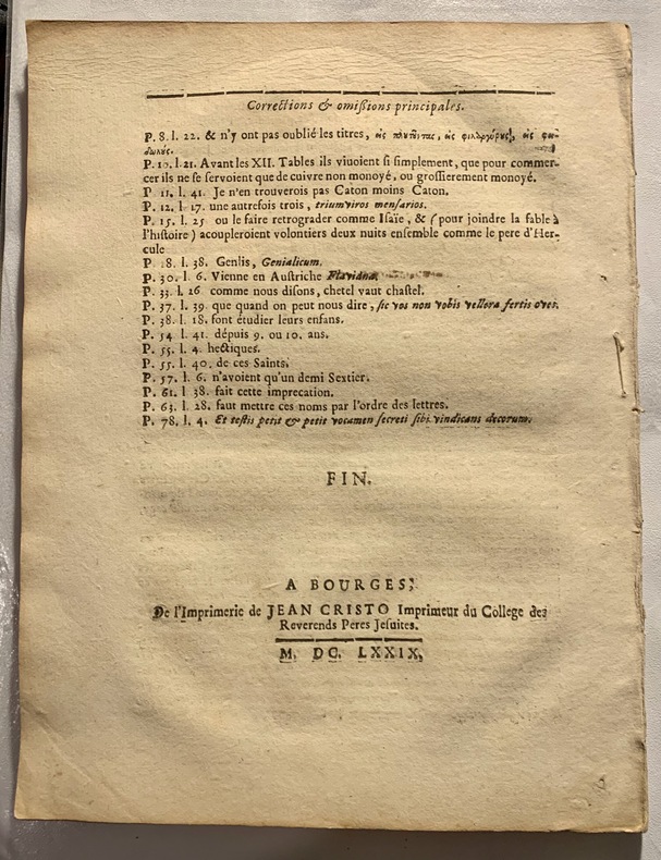 1679 ( Bourges, de l'Imprimerie de Jean Cristo, Imprimeur des Revérends Pères Jésuites), 1679; brochure in-4° de 91pp. 3 corrections manuscrites dont un ajout, une rature et rectification d'une date. Plusieurs feuillets jaunis, rares rousseurs. Cette étude, sans couverture, est vraisemblablement sortie d'une reliure.