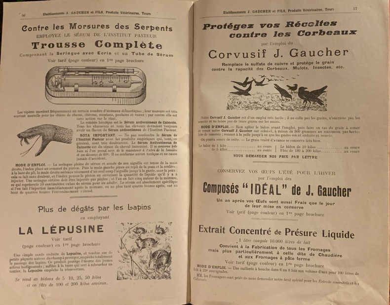 1920 Tours, Paris, Gibert Clarey, sans date (vers 1920); Catalogue in-8 agrafé de 64pp. Illustré en noir de dessins dans le texte et publicités pour produits vétérinaires. Couverture rouge illustrée en noir sur les 2 plats.