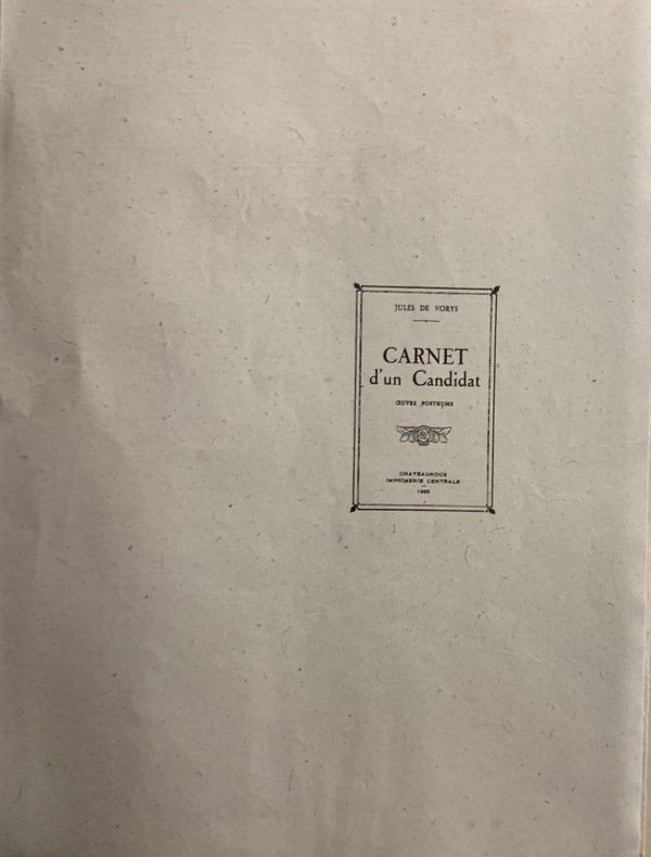 On a joint en début d'ouvrage, le prospectus de l'éditeur ( IVpp volantes) et réunies sous papier transparent, 22 feuilles de même dimensions que le livre, tirées sur papier ultra mince (ou Chine), reproduisant tous les titres des ouvrages publiés par Jules de Vorys, 2 pages autographes, une portée de musique, et quelques illustrations. Cet ensemble n'est pas signalé à la justification.L'auteur a dédié son livre à "Mon cher Thibault", lui rappelant qu'il a quatre-vingt-cinq ans et qu'il aime la Brenne. (Gr3)