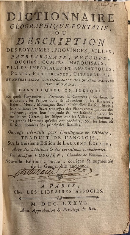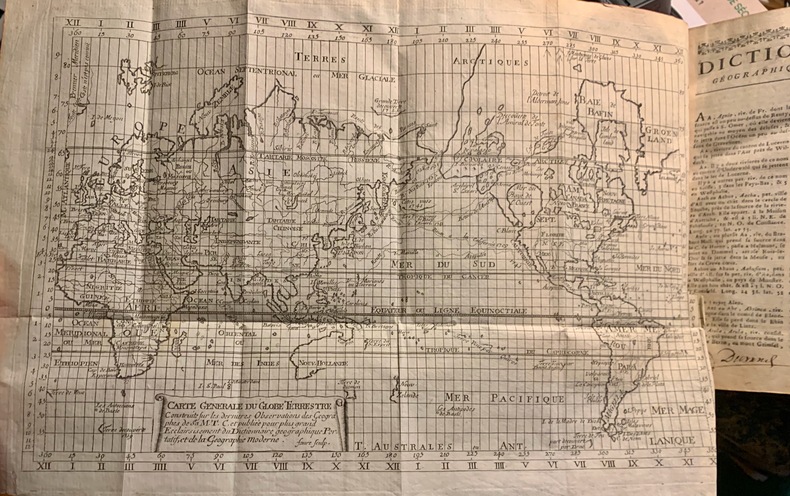 1776 Paris, chez les Libraires associés, 1776; fort volume in-8° de XII - 804 pp. avec 2 cartes dépliantes hors texte: carte de l'Europe divisée en ses grands états( datée 1759), et carte générale du globe terrestre (gravée par Faure). Pleine basane blonde de l'époque, dos nerfs, compartiments de filets dorés ornés de petits fers dorés, titre doré sur étiquette de maroquin rouge, tranches rouges.