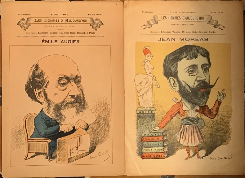 1885 Paris, Vanier, 1885; 2 livraisons in- 4° de 4pp. chacune de la revue "Les Hommes d'aujourd'hui", 1ère page illustrée en couleurs d'un portrait charge. - Emile Augier, N° 251, illustré par Emile Cohl, texte de Pierre et Paul.- Jean Moréas, N° 268 illustré par Emile Cohl, texte de Félix Fénéon ( petites déchirures en marge sans manque).