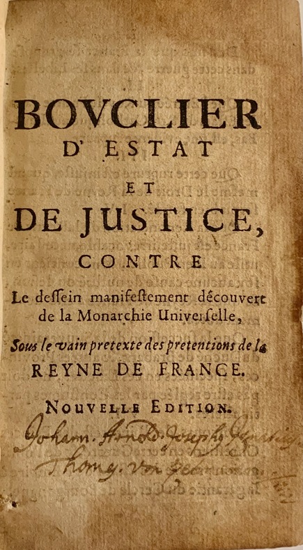 Lisola publiciste et diplomate né à Salins en 1613, fut un auteur politique et polémiste de grand talent ( cf. P. Larousse, Fourquet). Il est l'auteur de plusieurs ouvrages, plein de verve, contre Louis XIV, détesté vainqueur de la Franche-Comté. Cet ouvrage eut plusieurs éditions la même année. petites taches rousses au velin au 2ème plat. Bon exemplaire. (Reu-CO2)