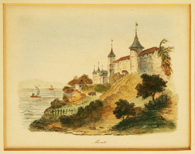 Avec le portrait de Charles le Téméraire et H. S v. Hallwyl, Feldherr / Plan du champ de bataille de Grandson / Vue: Le vieux Morat / le tilleul de Villars / Vue de Morat actuel (1876, xylogravure) / Ossuaire et l'obélisque / Plan dépl. du bataille de Morat.