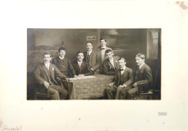 12.4x23 cm, montée sur support carton d’origine, 8 hommes en costard cravatte et avec leurs moutaches, 1 feuille