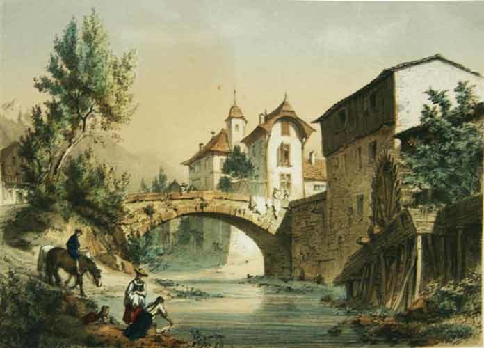 Paris, chez Bès et Dubreuil, avant 1866, 16x24 cm (image) / 26.5x36 cm (feuille), lithographie couleur, sous passepartout. Texte ‘Suisse 7’ sur l’image