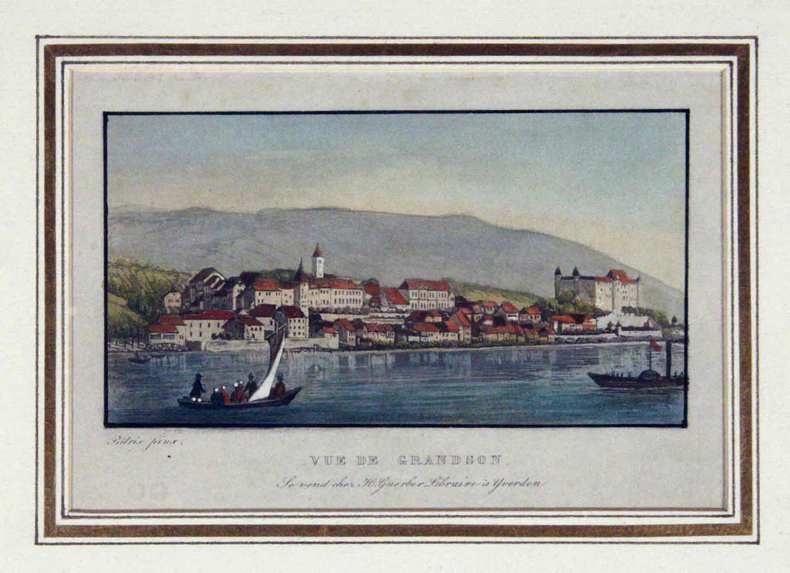 Se vend chez H Guerber Libraire à Yverdon, s.d. vers 1840, 6.5x12.5 cm, aquatinte coloriée à la main, 1 feuille encadrement or. (16.5x20.5). (RARE).