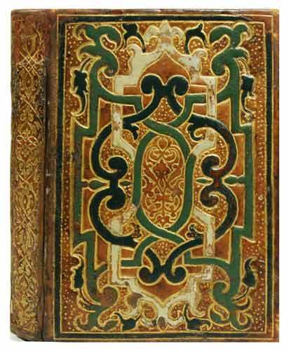 Rare impression de Rouen dans une superbe reliure groliéresque du style des reliures lyonnaises à mosaïque de cire. Mit 3 Holzschn. im Rund u. 1 Druckerm. 4 nn., 172, 8; 14 (recte 6) num., 2 nn. Bll. (d.l.w.). Französischer Kalblederband d. Zt. mit reicher Goldprägung und Wachsfarbendekor, beide Deckel mit verschlungenem Bandwerksdekor in Grün, Schwarz und Grau, äußere und innere Felder mit Goldpunkten gefüllt, im Zentrum eine goldgeprägte Arabeske, alles eingefasst von schwarz ausgemaltem Filetenrahmen, Rücken mit floraler Goldprägung, Stehkantenvergoldung u. Goldschnitt; etwas abgegriffen, einige unauffällige Restaurierungen an den Ecken, Gelenken u. am oberen Kapital. Adams, I, 1205 (seulement l’éd. de Paris de 1550); pour la reliure cf. Devaux, Dix siècles de reliure; Gumuchian cat. XIV, n° 175bis; Jean Toulet: L’école lyonnaise de reliure (dans ‘Le siècle d’or de l’imprimerie lyonnaise’, 1972). Image disp.