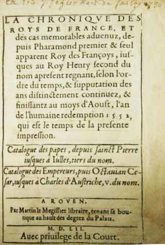 Rouen, Martin le Mégissier, 1552, in-8vo, (16.5x11.2 cm), 3 gravures sur bois en médaillon (portraits de rois) + 1 marque de l’impr., avec anciennes notes d’encre brune ms. dans les marges de 4 pages au début, sur la dernière feuille avec la marque de l’éditeur un petit bout en bas manquant, avec petit ex-libris ms. de 1730 en-haut du titre, dans une reliure française (dite reliure lyonnaise), entièrement mosaïquée à la cire d’une très belle harmonie de tons, tranches dorées. (Reliure de l’époque).