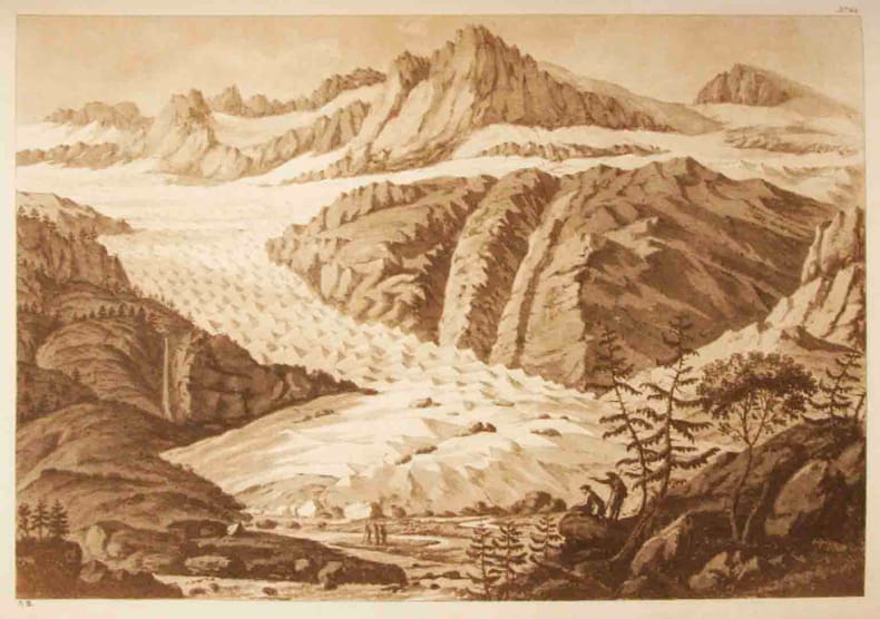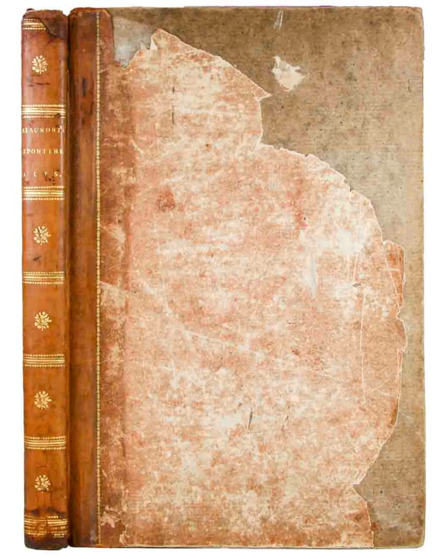 London, Printed by S. Hamilton, for G.G. and J. Robinson, 1800, in-folio, 4 leaves (1 blank - printed title-page - advertisements - contents) + 1 engraved title-page with view + 218 p. + 1 blank leaf + 1 folded handcoloured engraved map ‘Chart of places... including the principal peaks of that chain of the alps from the Buchetta to Mont St. Gotthard’ + 1 townmap of Lyon in black + 25 plates printed in brown (soot brown or bistre), with most of the original protective tissue gards (mostly browned in the margins), some waterstains to the lower margins of the engraved title-page and some others, hw. ownership on first free fly ‘J. Matilda Scott’, Original leather spine, boards with rests of orig.-paper. Used.