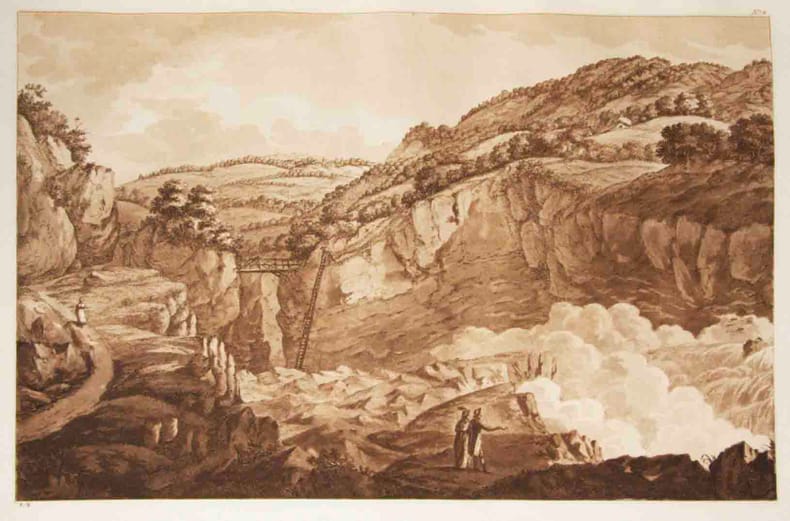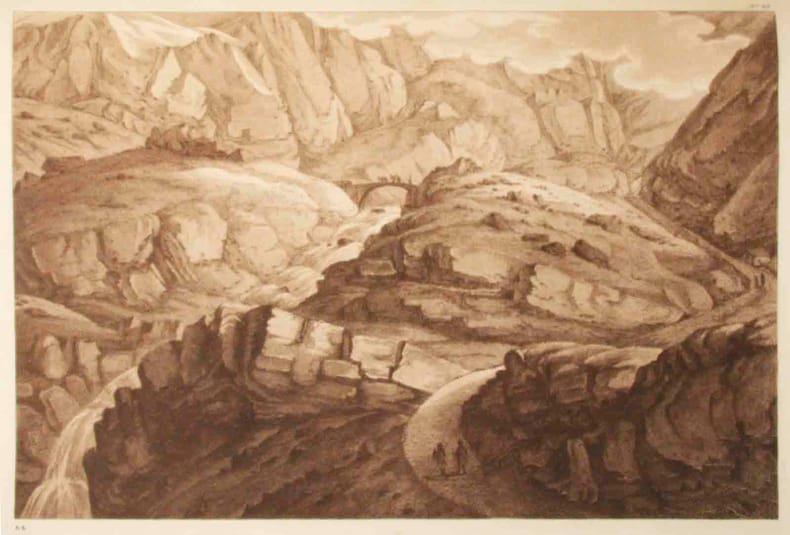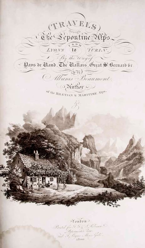 First edition, reprinted in 1806. This book has never been translated into French. Illustrated engraved titlepage with view followed by the numbered plates I to XXVII, which include 1 general coloured map, 1 town-plan of Lyon printed in black and 25 views printed in brown (bistre), all after drawings by Albanis Beaumont. List of plates: Plates numb. I -XXVII: Vue de Lyon, taken from the Arsenal / Lyon Aquaduct, built by the Romans / Voltaire’s Tomb - Roman Theatre at Lyons / Geometrical plan of Lyons including the New Buildings of Parrache (tirage en noir) / Cascade and Lake of Nantua / Town of Nantua, Continuation of the same / Representation of the above Lake / Loss of the Rhone (Perte du Rhône) / Re-appearance of the Rhone / Fort of Cluse / Ferney / Geneva / Versoix / Morges / Lausanne / Vevay (sic.) / Salt-Works at Bex, Canton of Berne (sic.: aujourd’hui Vaud) / Bridge of St. Maurice on the Rhone / Martigny and the Valley of the Rhone / Glacier between those of Valsoray and La Valpeline / Summit of the great St. Bernard, inculding the Hospice or Convent / Sion / Source of the Rhone and Glacier of la Furca / Ascent of the St. Gothard / Hospice on the St. Gothard / The Devil’s Bridge. Abbey: Travel in Aquatint & Lithography n° 53; Wäber, 109; Perret 333: Bel album rare et recherché pour la qualité des illustrations. Image disp.