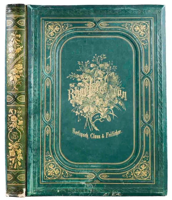 München u. Berlin, Friedrich Bruckmann,’s Verlag, o.J. (1872), in-Folio, 1 Bl. + illustr. Titel in Xylogravure + 100 S., illustriert mit 48 Holzschnitt-Vignetten nach G. Roux, Text umrahmt mit dopp. Linie + 24 Tafeln mit photogr. Reproduktionen nach Malereien v. Fröhlicher u. Closs, originaler blind- und goldgepresster grüner H.-Lederband, Scharniere beschädigt, Deckel staub- und feuchtfleckig, Einband signiert ‘R. Gerhold, Leipzig’, Goldschnitt.