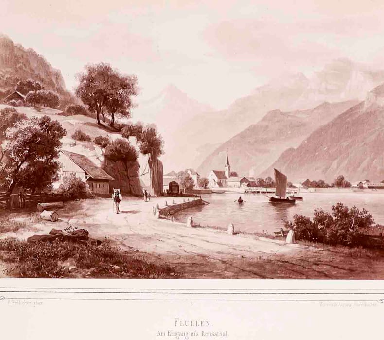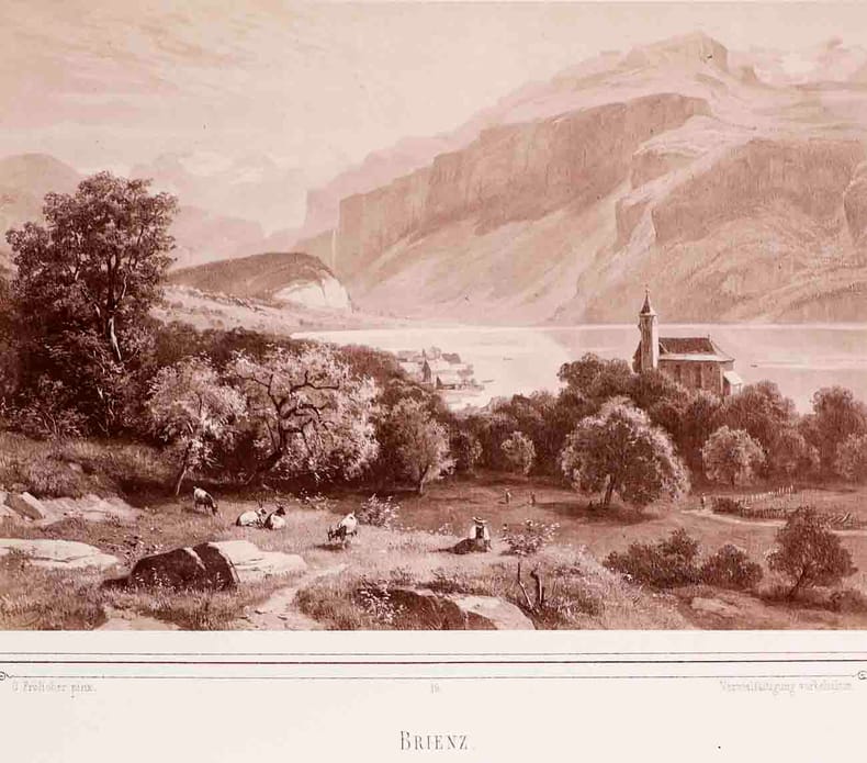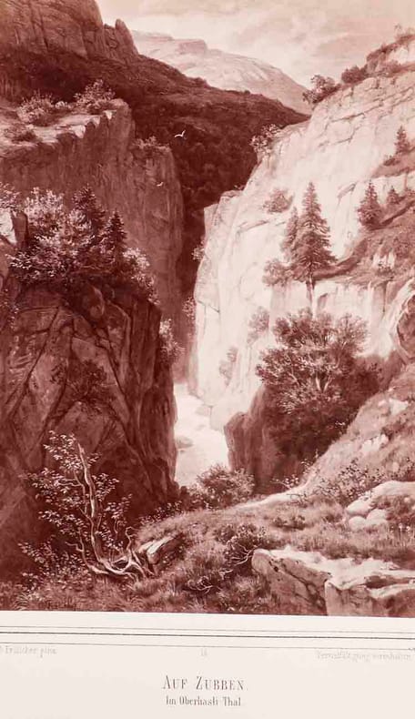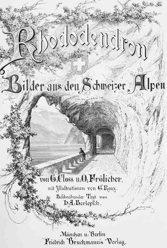 Mit photographischen Reproduktionen schöner Stimmungsbilder u.a.: Pilatus (von Stansstad gesehen) / Rigi (auf dem Wege von Staffel zum Kulm) / Brunnen und die Mythen (vom Waldstätterhof gesehen) / Uri-Rothstock (auf dem Wege nach Axenstein) / Lowerzer-See (von Goldau aus) / Axenstrasse (von Fluelen aus) / Fluelen (am Engang in's Reussthal / Die Teufelsbrücke (an der St. Gotthard-Strasse) / Auf der Furka (gegen das Finsteraarhorn gesehen) / Rhône-Gletscher (von der Mayenwand aus) / Auf der Grimsel (Saumpfad nach der Hauseck) / Meiringen (im Hasli-Thal) / Brienz / Der untere Grindelwald-gletscher (vom Friedhof zu Gydisdorf) / Der Eiger (von der kleinen Scheideck) / Die Jungfrau (auf dem Wege nach Mürren). Xylographische Illustrationen von Gustav Roux.. Wäber BSL III/95 (EA 1872, 2. Ausgabe 1873) Image disp.